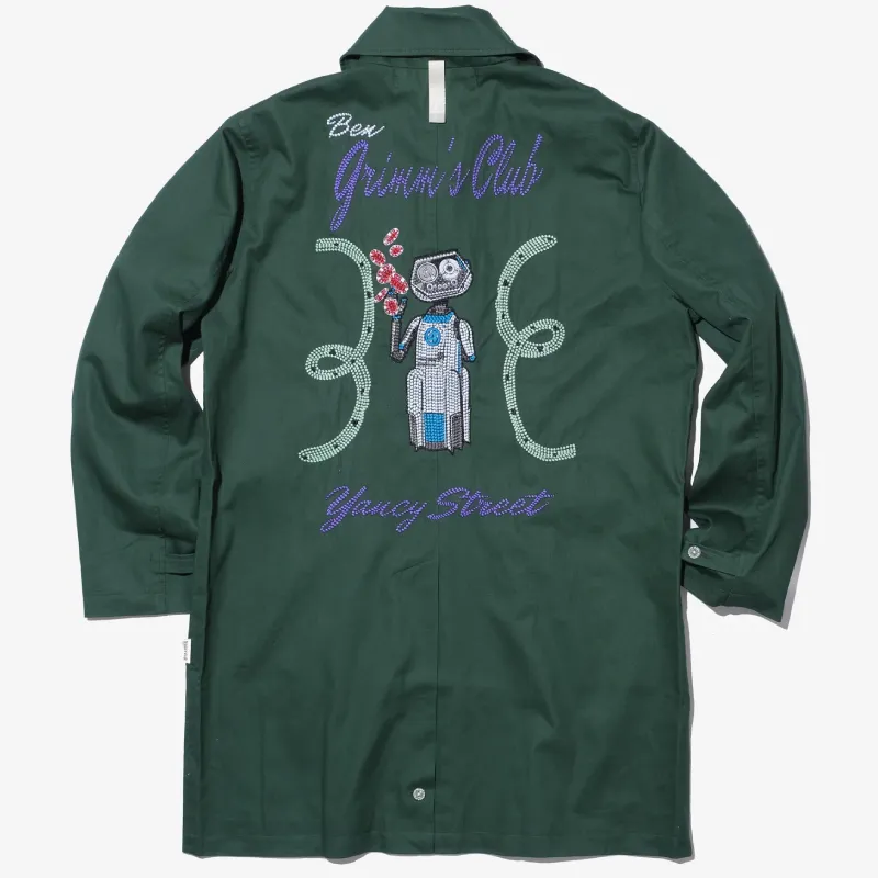 The back showcase a robotic figure presenting roses under curved Ben Grimm’s Club lettering with Yancy Street below. The inner white lining, filled with trench-coat silhouettes and repeating GRIMM, finishes the piece with a hidden visual punch.