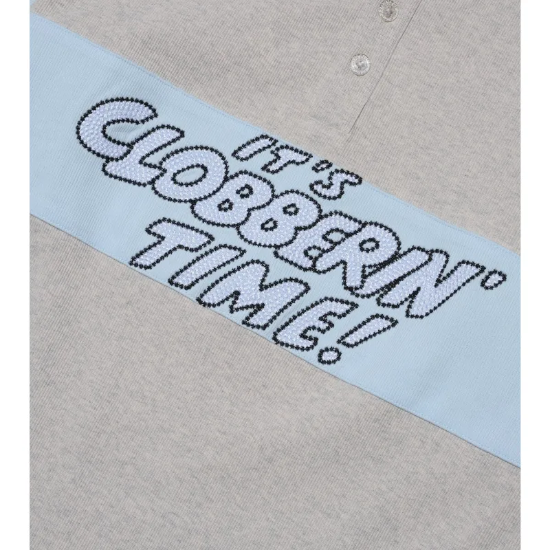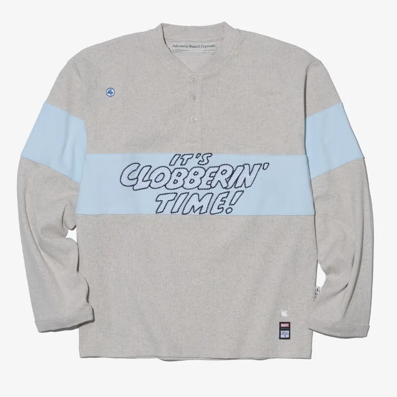 Step into comfort and style with the Grey ABC x Fantastic Four Clobberin Time Ribbed Henley. This long-sleeve rugby-style shirt features a soft cotton-polyester blend with a ribbed thermal texture for cozy wear. The grey base is highlighted by a bold light blue stripe across the chest, embroidered with “IT’S CLOBBERIN’ TIME!” in white and black, paying homage to The Thing.