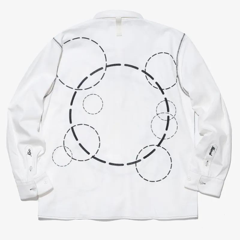 Make a statement with our White ABC x Fantastic Four Invisibility Forcefield Shirt, a bold mix of art and fashion. Its white body is detailed with contrasting black stitching along seams, emphasizing its sharp lines. The shirt’s front and back display a layered pattern of circular outlines and a prominent central dashed circle, complemented by small embroidered Marvel and ABC text on cuffs and hem.