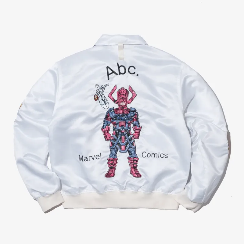 We present our White ABC x Fantastic Four Needlepoint Souvenir Jacket. We craft this jacket with detailed needlepoint artwork that highlights the iconic Fantastic Four characters on the front, paired with the year 2025 for a modern touch. On the back, we showcase a striking Galactus graphic with the Silver Surfer drifting beside him, framed by our Abc. signature above and Marvel Comics below.